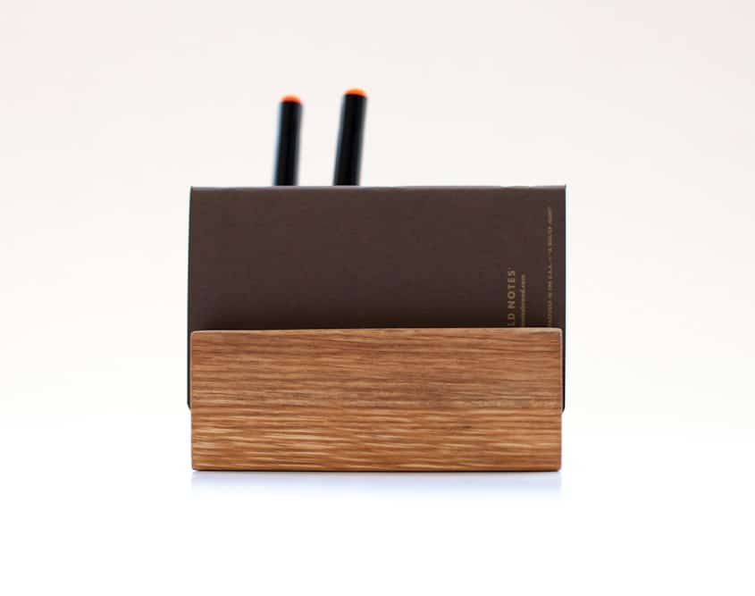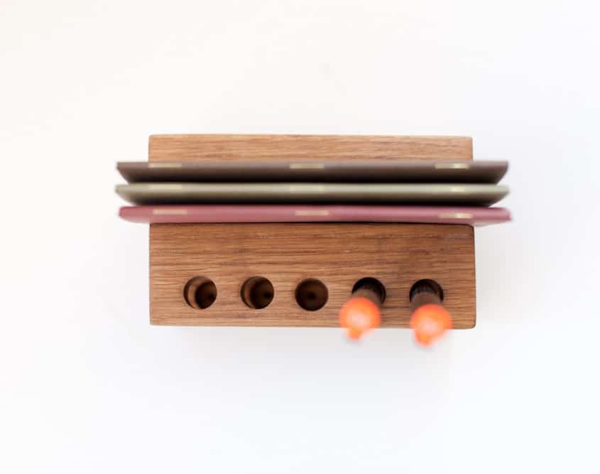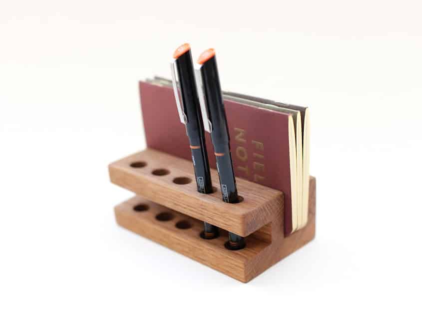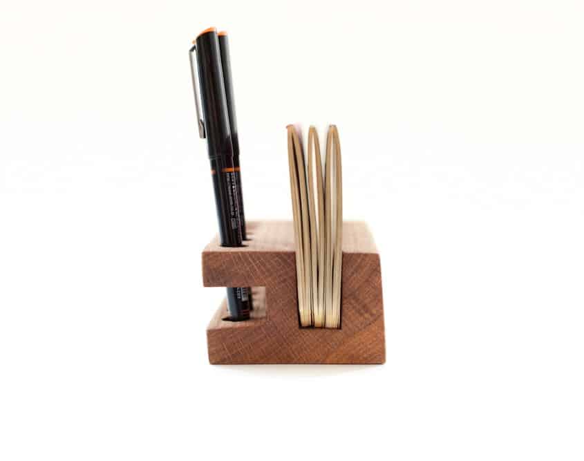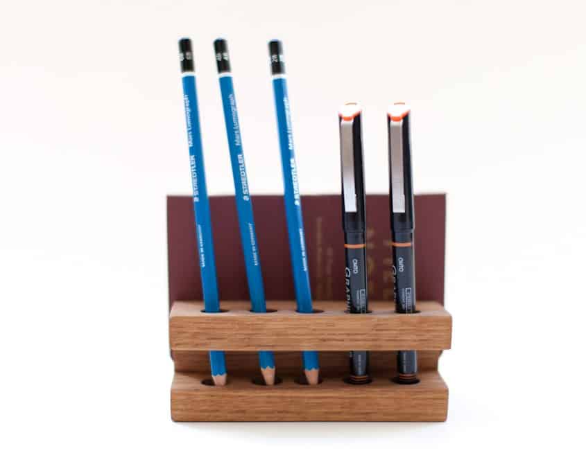 Håndlavet kælderproduktion. Lavet i Egetræ med 5 huller til penne og blyanter samt en sliske til notesbøger. Behandlet med naturolie.
