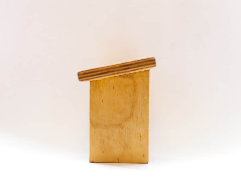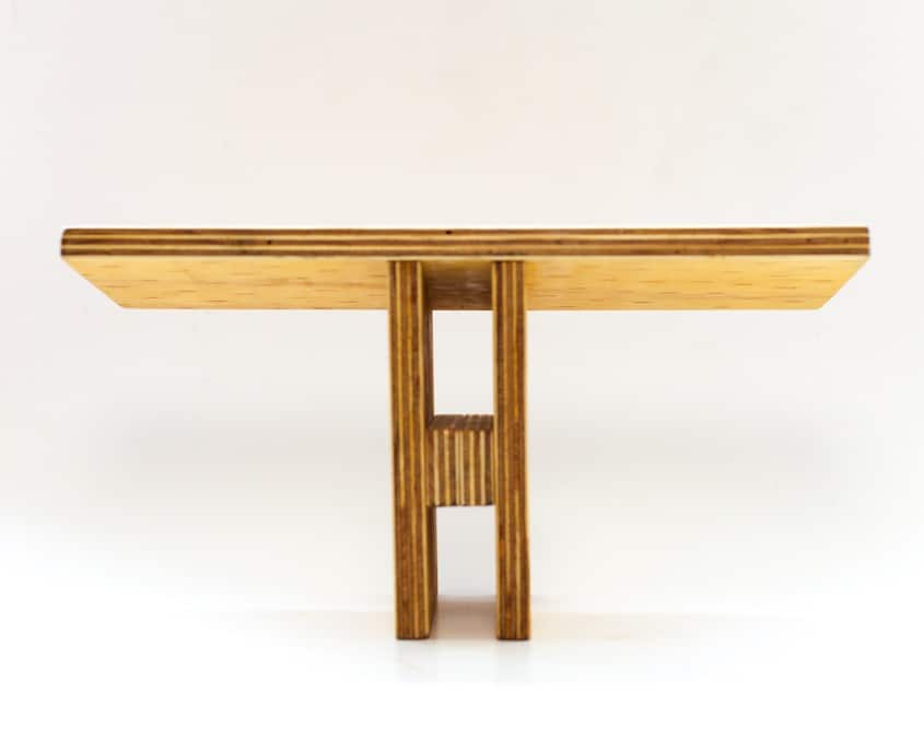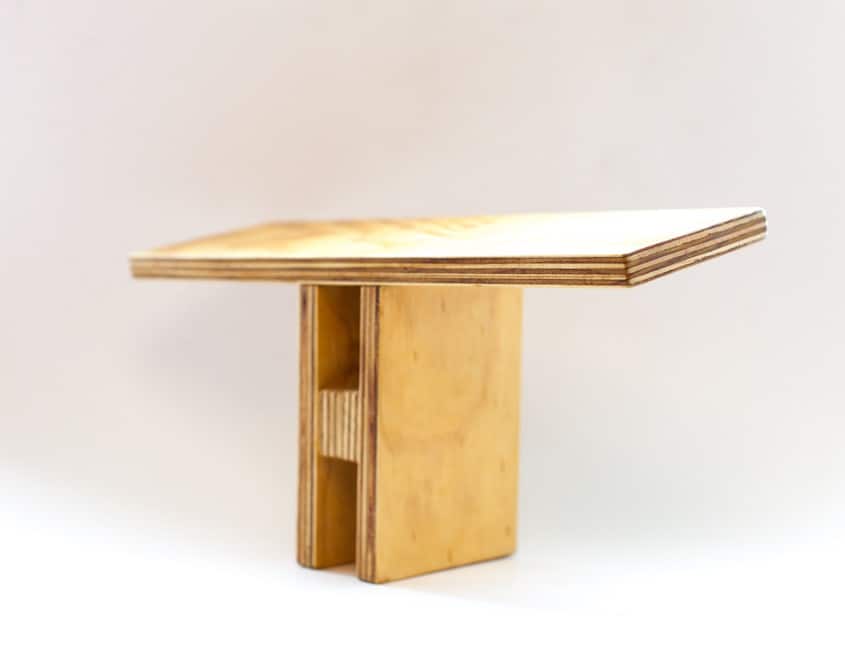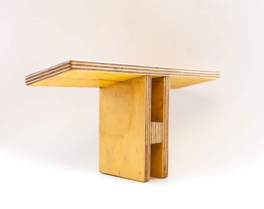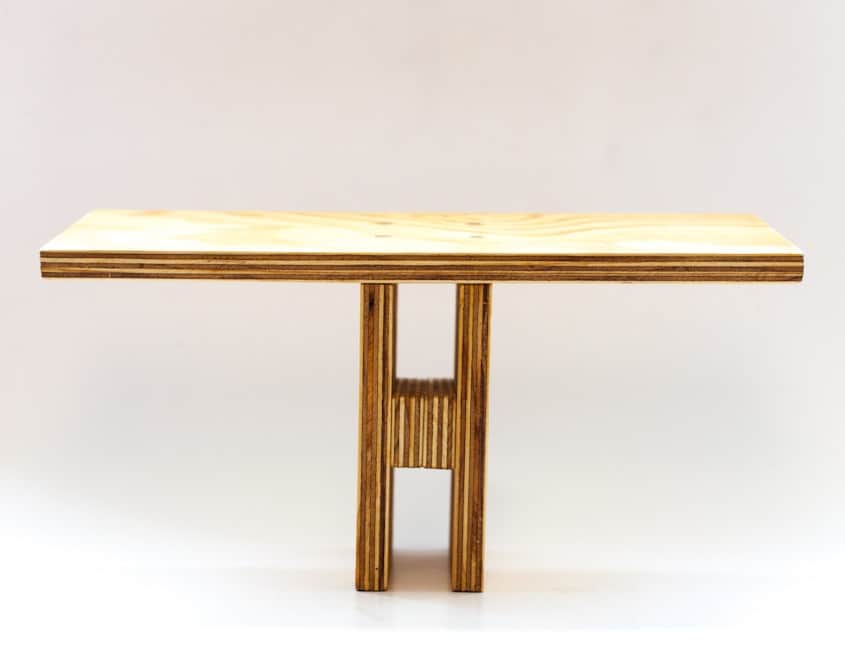 Det første bænk-projekt, lavet foran caféen efter et Vipassana ophold i de svenske skove. Denne bænk er lavet af krydsfiner, tror det er birk, i cirka 7 lag. Samlet med 4 små skruer, gemt væk under træmasse, og lim. Behandlet med naturolie.